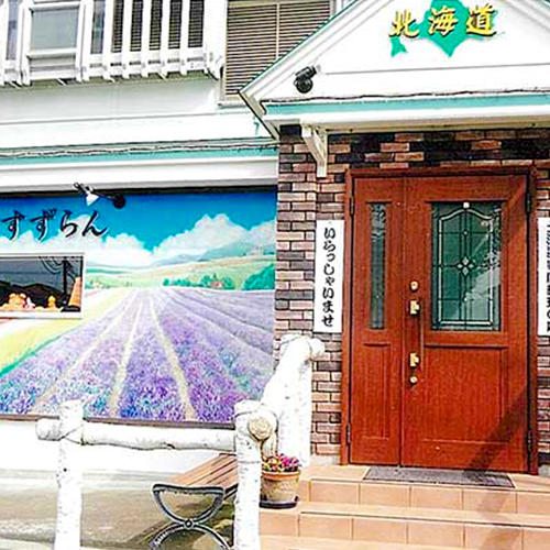 ラベンダーの花畑が壁いっぱいに描かれた白樺の手すりが目印のお店です。